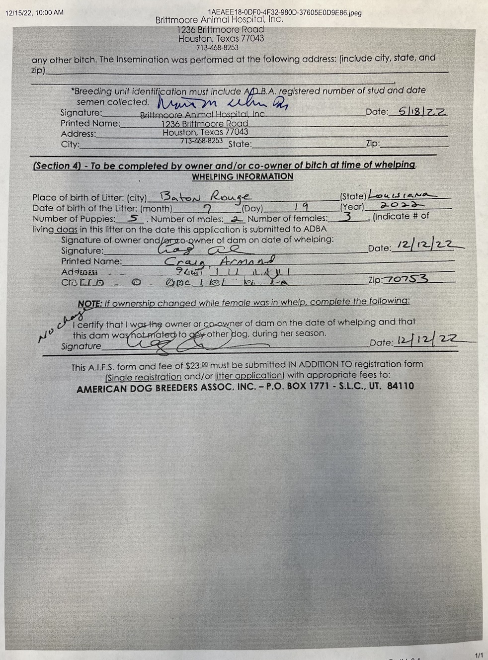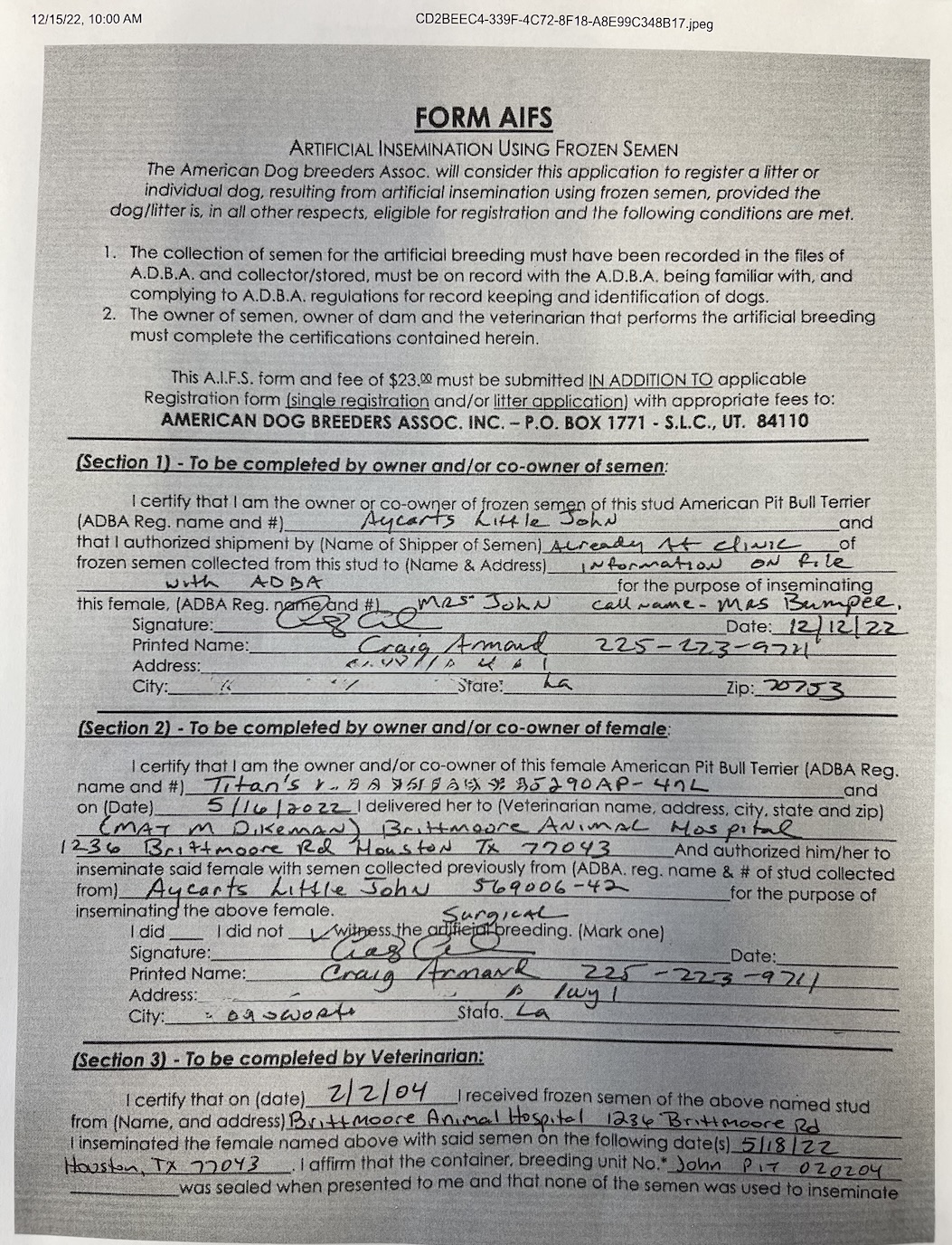 As shown below, in Form AIFS, Section 3, the inseminating veterinarian is required to list: